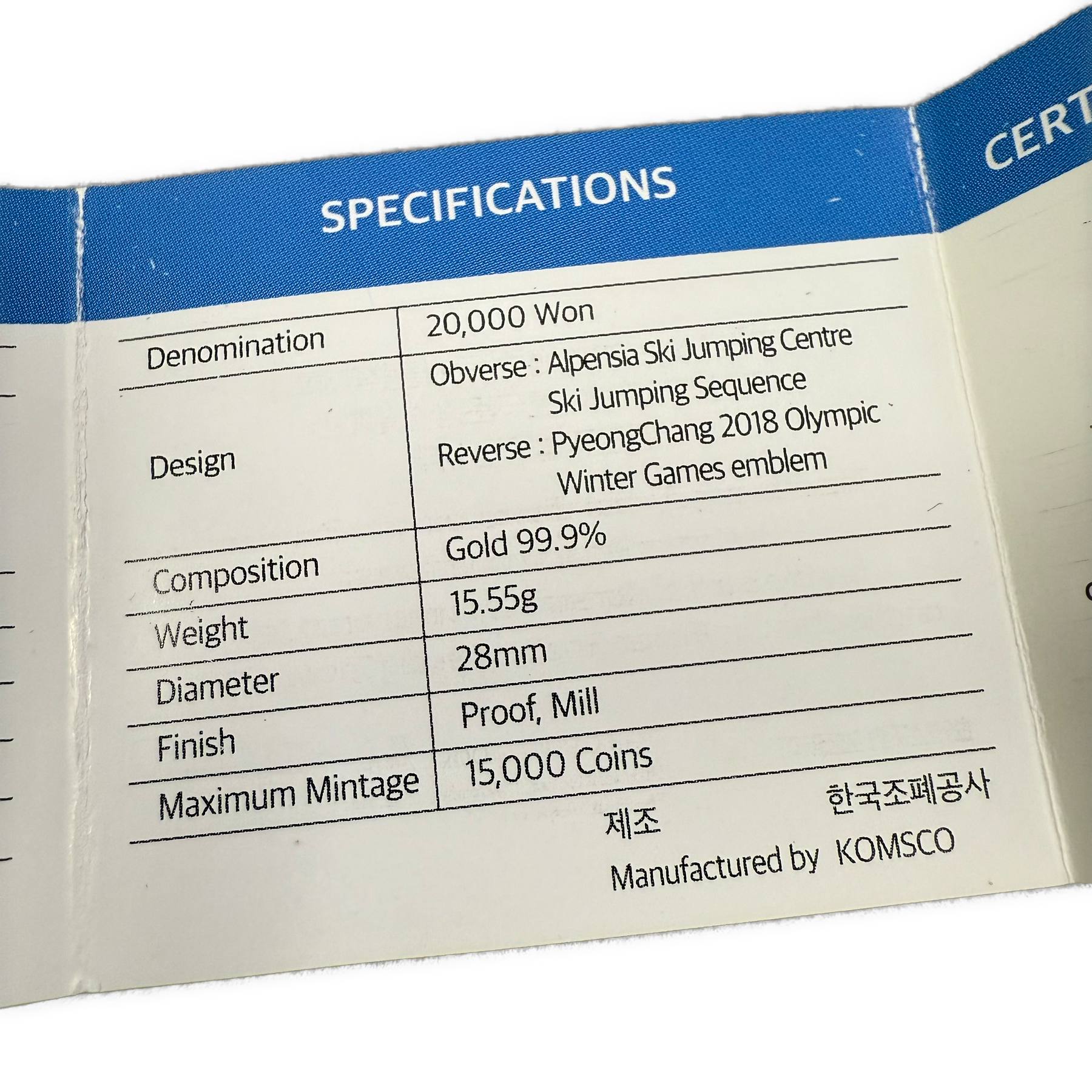 1/2oz .999Au (Spot+2%) 20,000 Won 2018 PyeongChang 2018 Winter Olympics