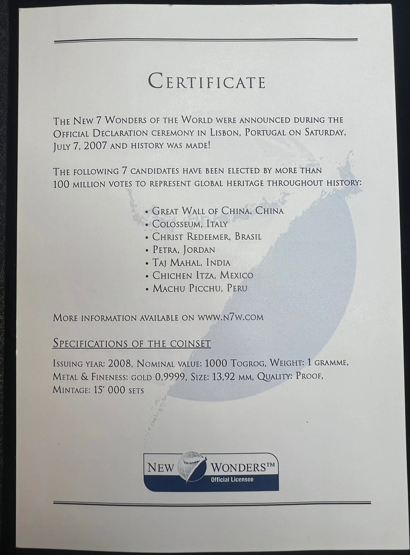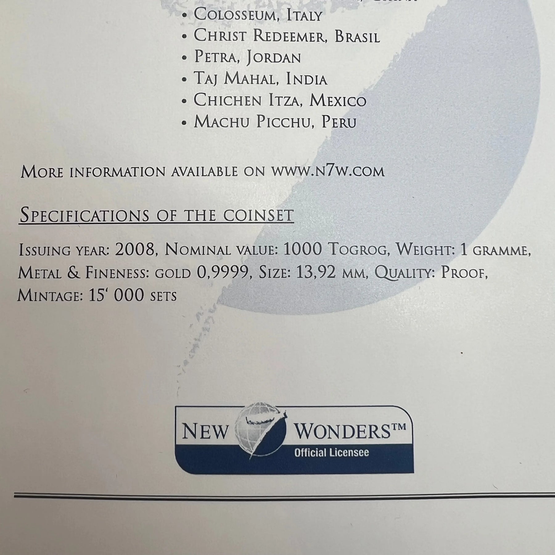 7g .999Au (Spot+2%) 7 Wonders of the World 7x1g 1000 Terper Mongolia 2008