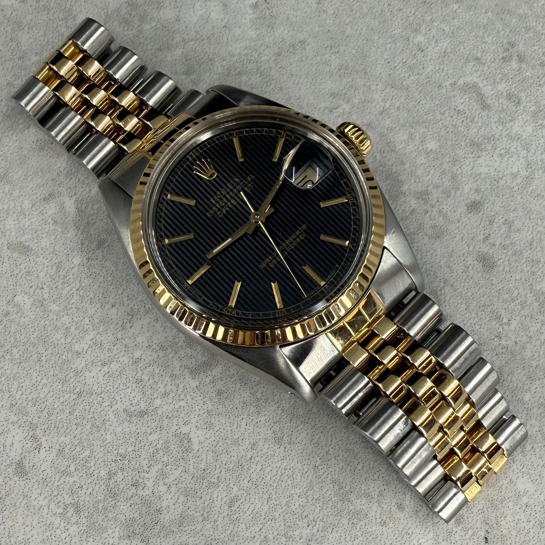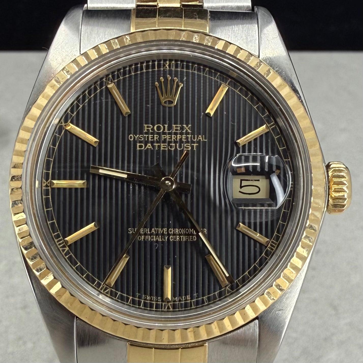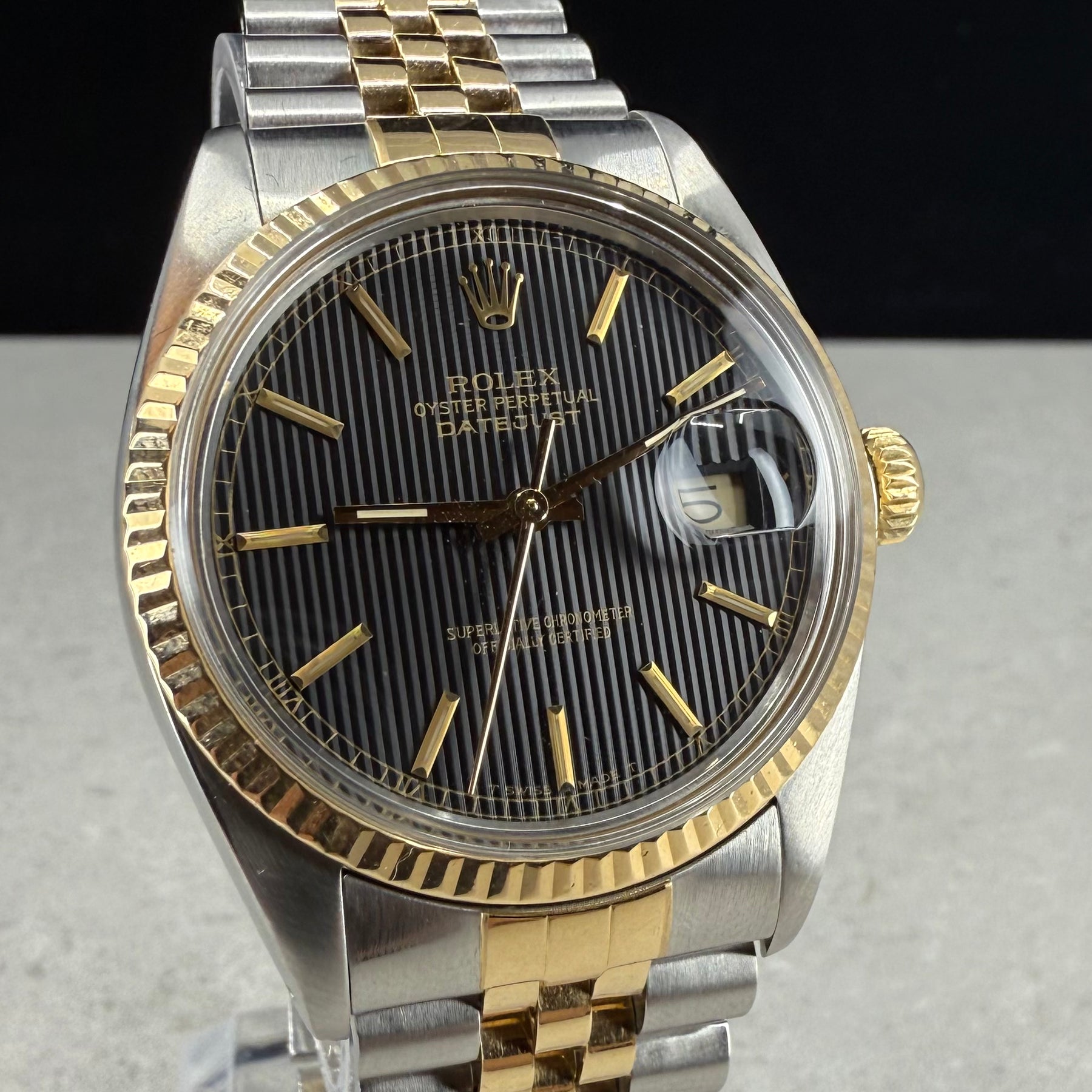 Klassisk og elegant Rolex Datejust ref. 16013 fra 1986, med «Tapestry» skive. Urkassen i stål med rillet bezel i 18K gult gull og original Jubilee-lenke i stål/gull.