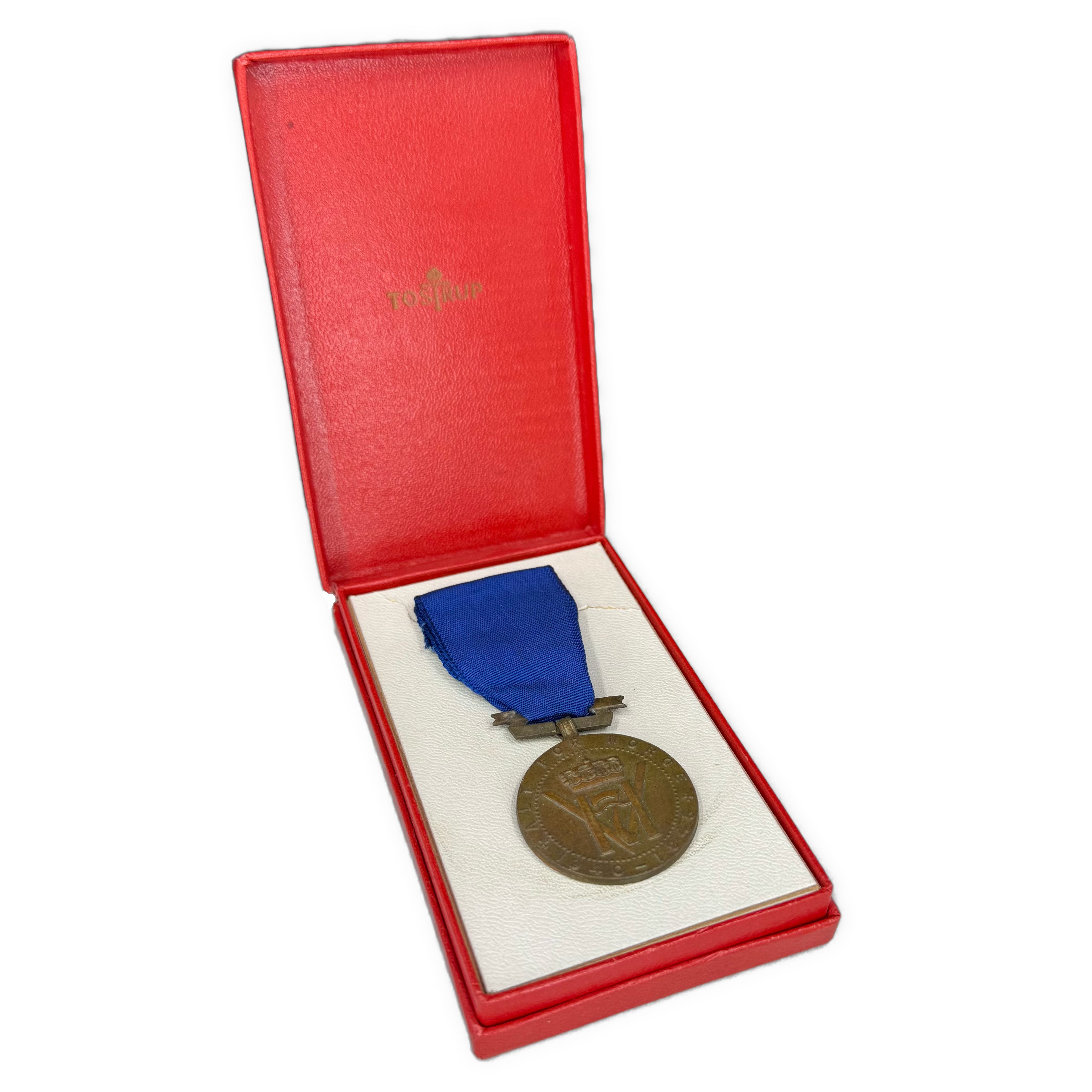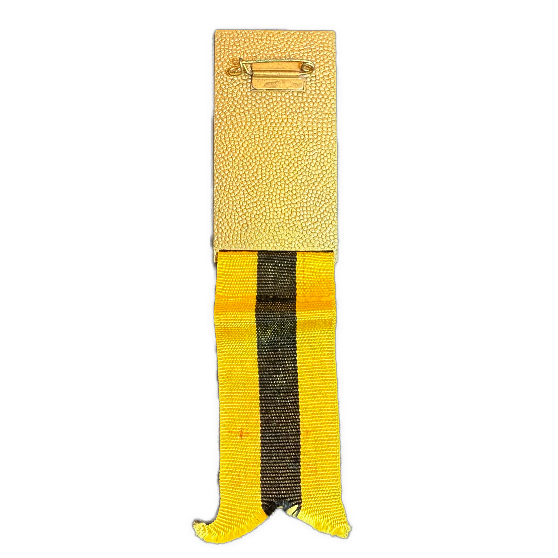 Originalt bånd i gult og sort med tydelig tidsriktig slitasje nederst. Medaljen er hel og komplett med original nålfeste på baksiden.
